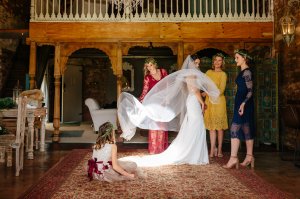Hair extensions, a full, voluminous, half up half down bridal hairstyle