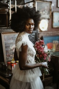 A modern bridal up style hairstyle with retro feel.