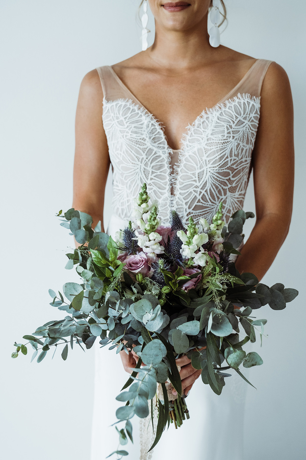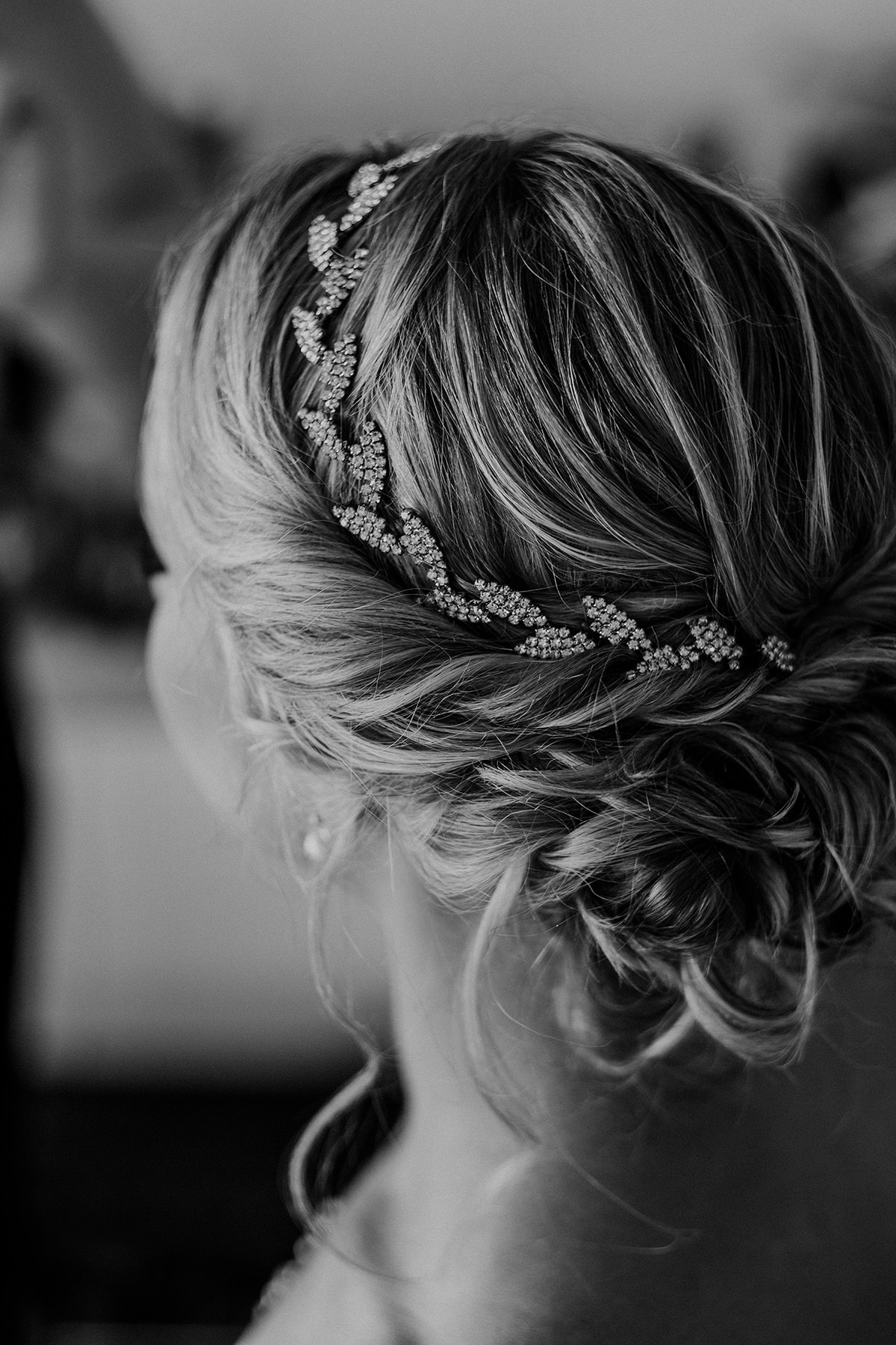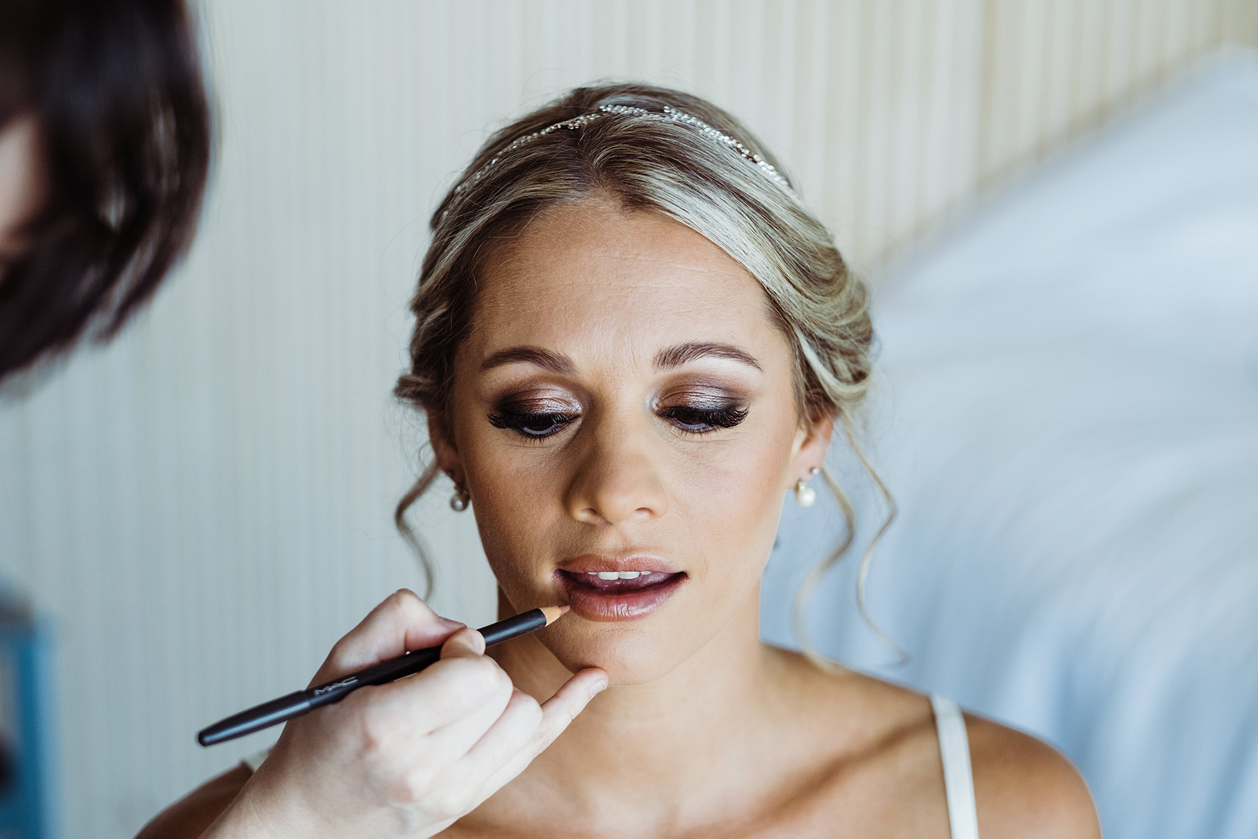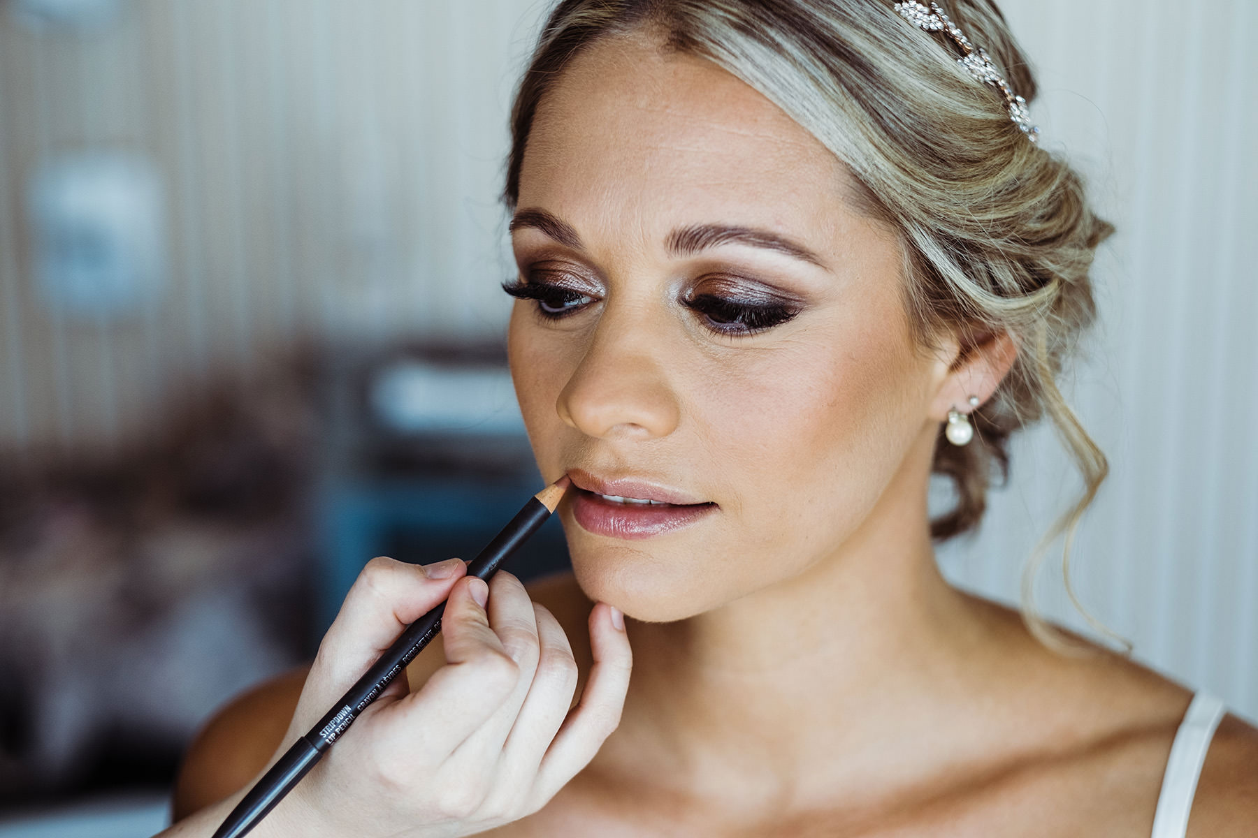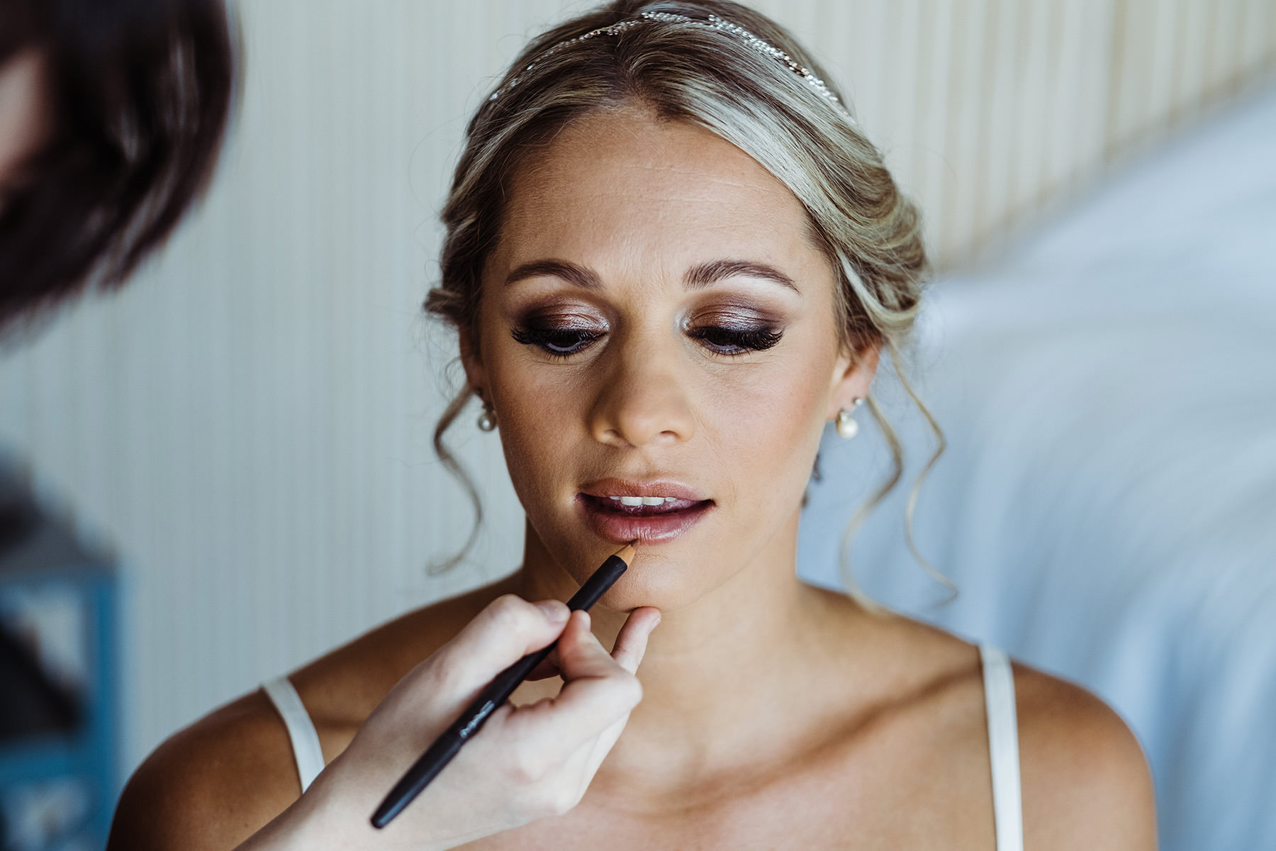 Her wedding morning bridal hair and makeup look was something she could have done and not have to worry about all day. She went for a fuss free bridal upstyle and a bolder, shiny eyeshadow to add dimension to her eyes with glowy, highlighted skin. Her lip of choice was a soft nude lip.