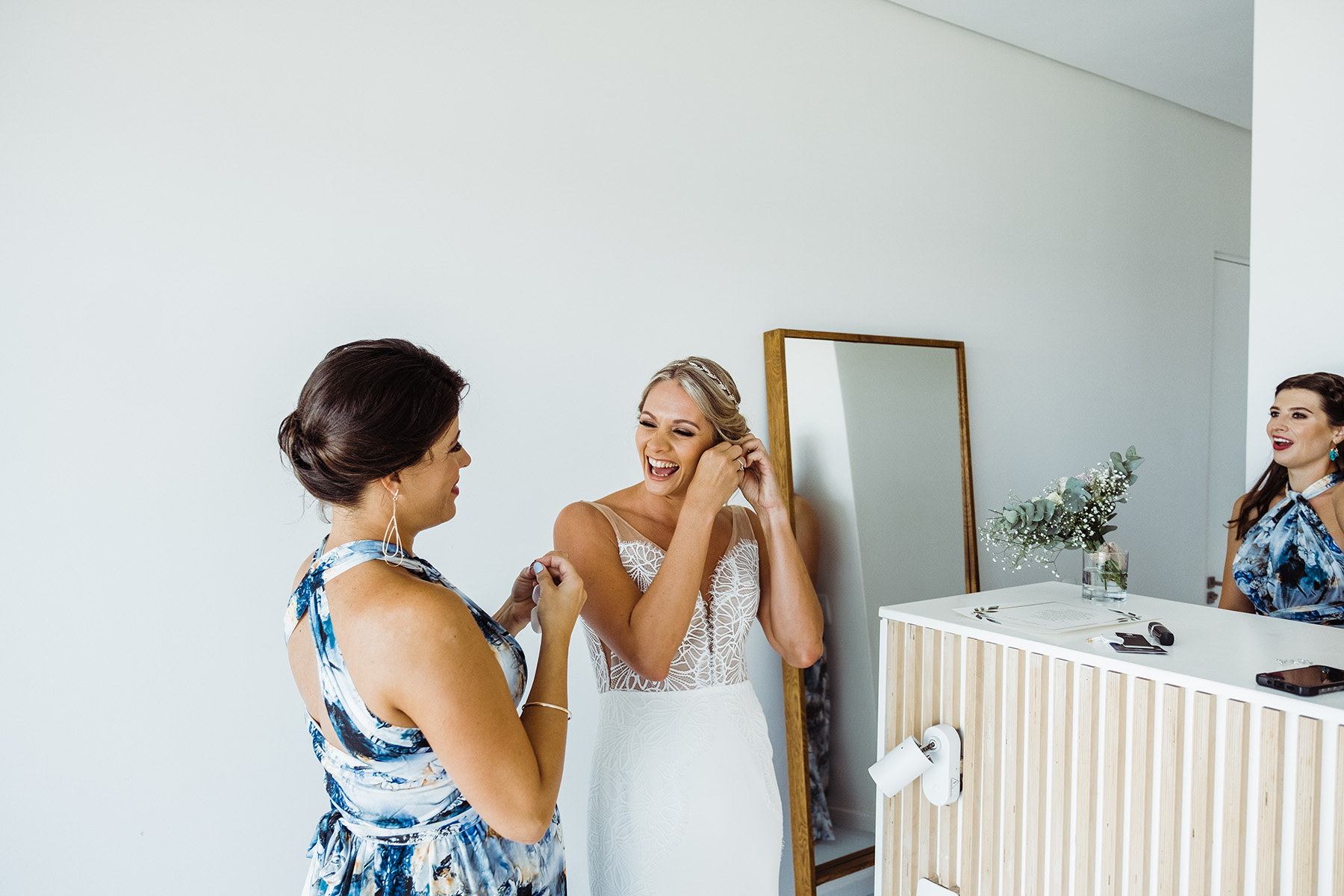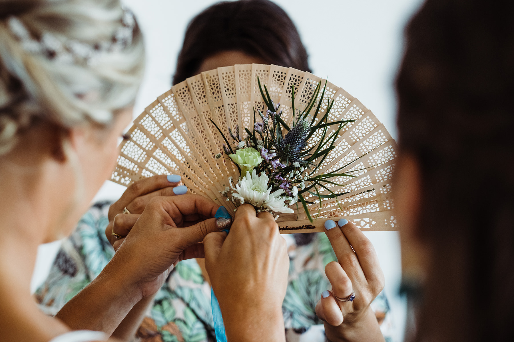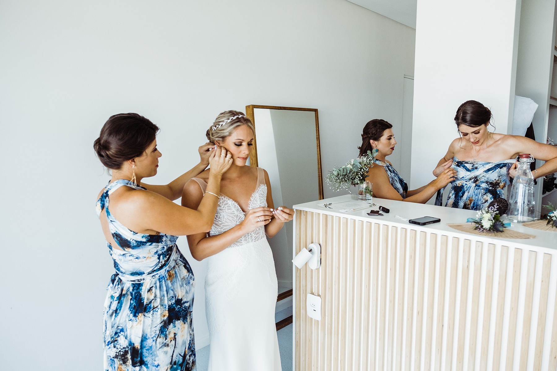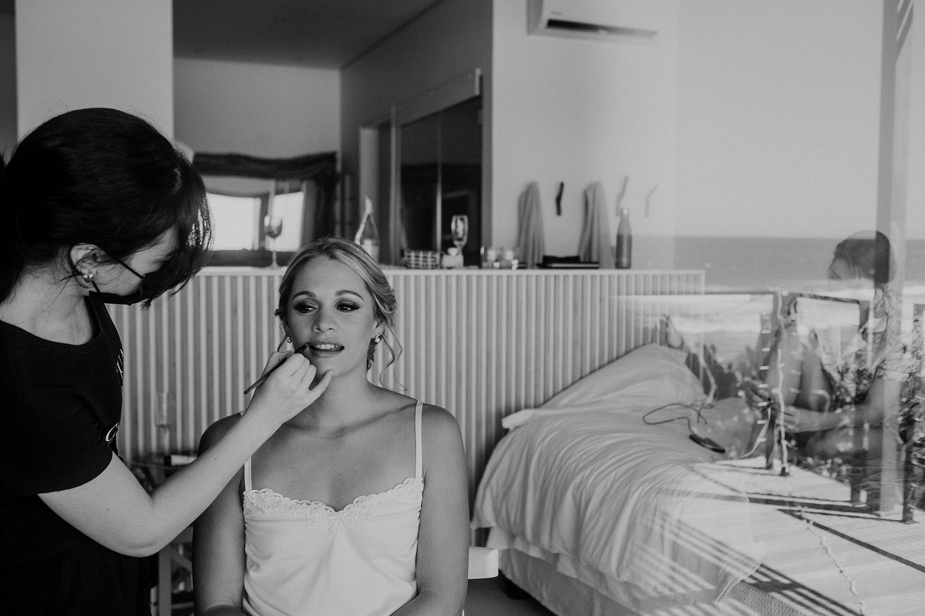 Her wedding morning bridal hair and makeup look was something she could have done and not have to worry about all day. She went for a fuss free bridal upstyle and a bolder, shiny eyeshadow to add dimension to her eyes with glowy, highlighted skin. Her lip of choice was a soft nude lip.