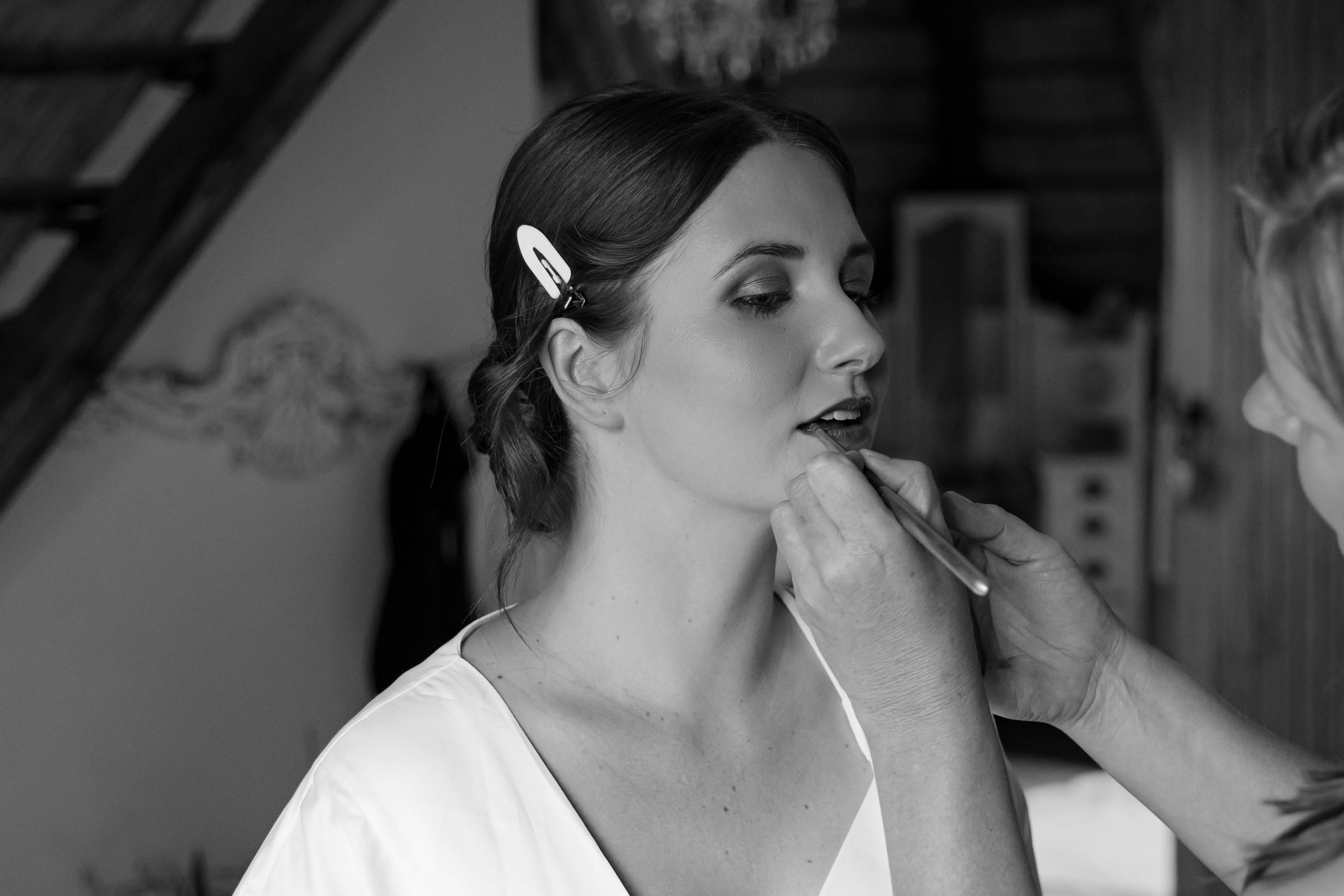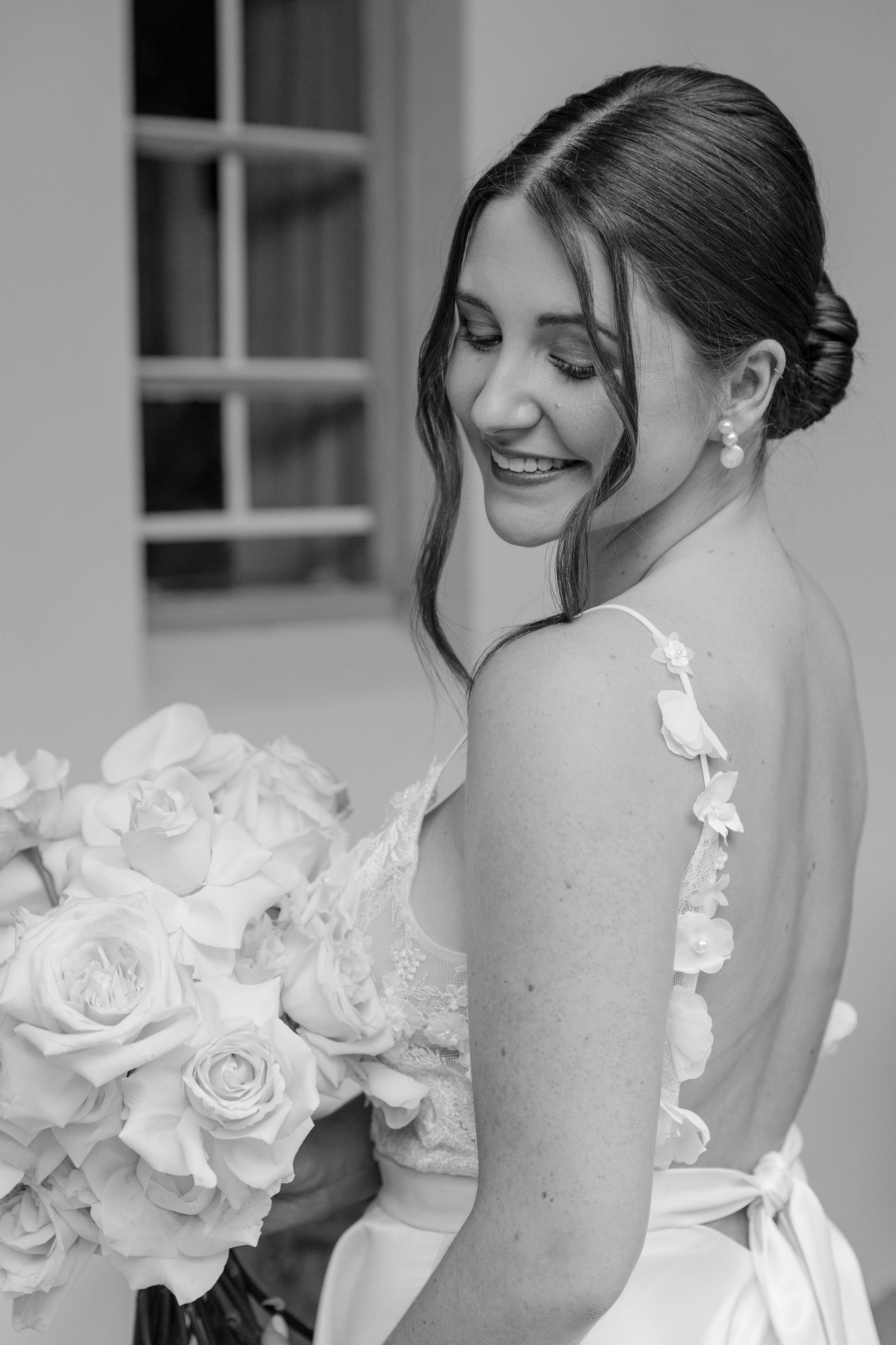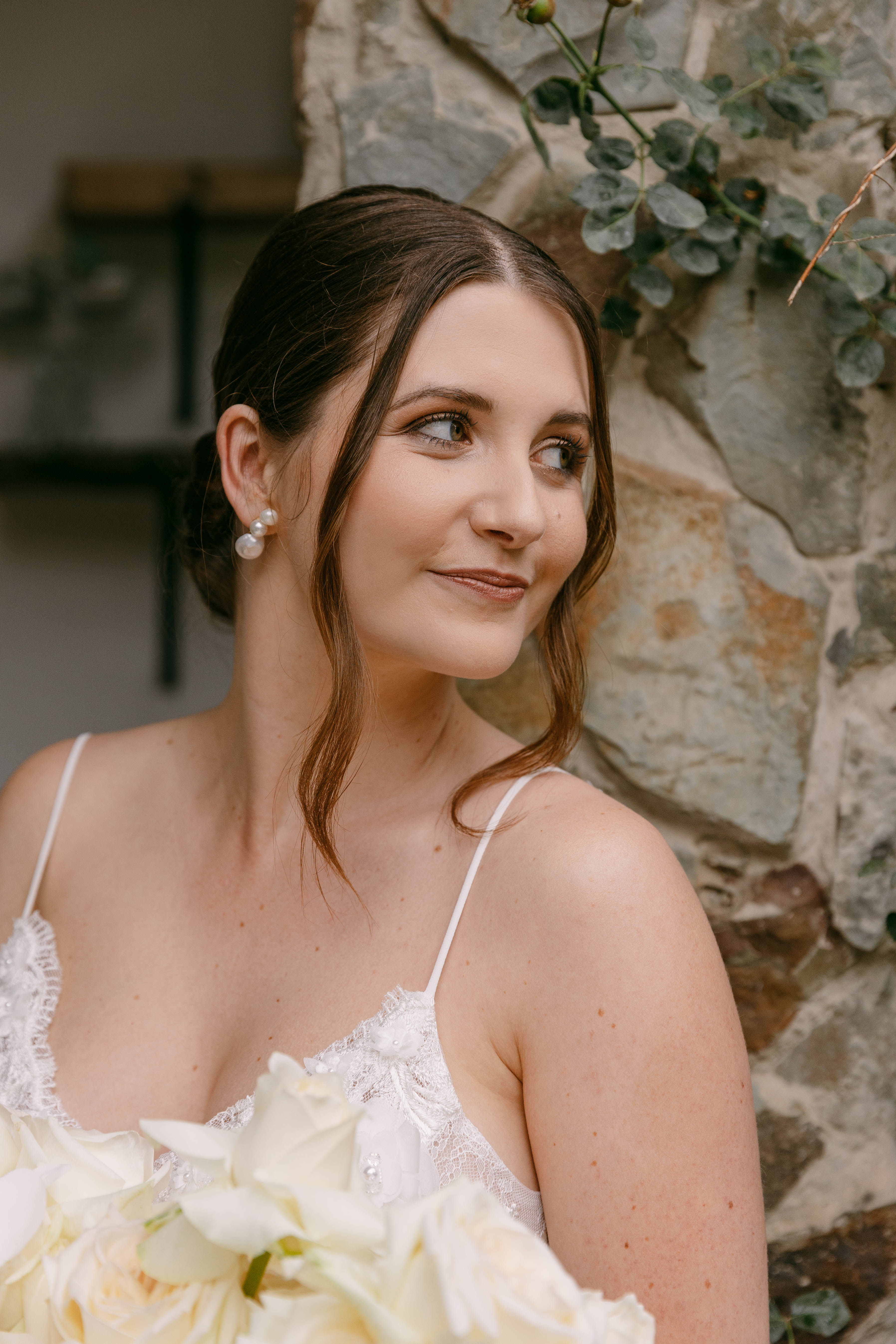 Accentuate bride Tyla, chose a modern middle parting with smooth bun for her bridal hairstyle. Her natural makeup look accentuated her beautiful brown eyes with a netural bridal makeup look consisting of browns, bronzes and some slight shimmer on the inner corners. The overall vibe of her bridal hair and makeup look was chic and modern, but still had an element of timelessness.