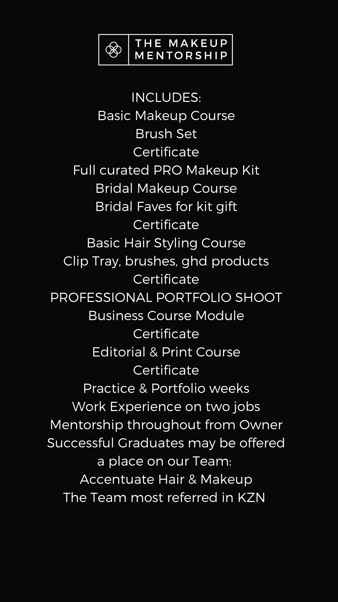 OPTIONAL ADDITION: DIPLOMA IN HAIR AND MAKEUP ARTISTRY After 90 hours of signed off practice hours (roughly 2 yrs) following successful completion of their Mentorship Program, students are eligible to apply for their Diploma and MAC discount card. The cost to complete your diploma is an annual registration fee of R25,000 (payable upfront on completion of the Mentorship Program) You will submit your work at the end of every quarter (March/June/Sep)